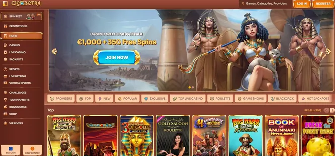 A cleobetra casino review naturally starts with variety. The lobby blends modern casino games with a busy sports betting hub and crisp live casino streams, wrapped in an ancient egypt theme that’s hard to miss. Between headline promos for new customers, a deep bench of game providers, and flexible banking, cleobetra casino stands out among contemporary online casinos.